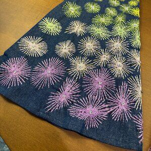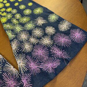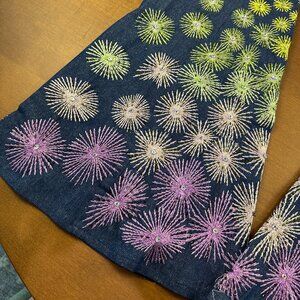 These are authentic Christian Dior by John Galliano 'Firework' flared denim trousers / jeans that were seen on the Dior Spring/Summer 2002 runway collection (last image). These jeans are constructed of a beautiful dark blue denim with delicate metallic fibers woven throughout, which gives the pants a stunning shine in motion. Features firework embroidery that descends down the jeans in beautiful hues of yellow, green, light pink, and purple. Each firework has a sequin in the center that adds an additional sparkle. Jeans have a front metal button (that says Christian Dior) and hidden zip closure. Condition: These jeans are in excellent condition, there is no sign of pilling or wear on the interior, on the exterior there is 1-2 missing sequins and a few fireworks that have a frayed thread. These frayed threads could be easily fixed and sewn back in. These jeans have not been altered from their original state.