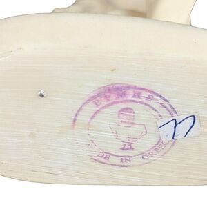 The statue is a cream color and stands 12" tall, with a total length of almost 8" from head to hand. The material is likely resin or a similar composite, giving it a smooth and polished finish. Its in very good condition with some minor marks, as shown in the photos, which add to its vintage charm.