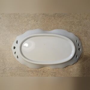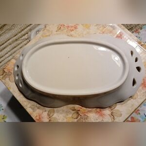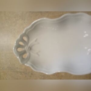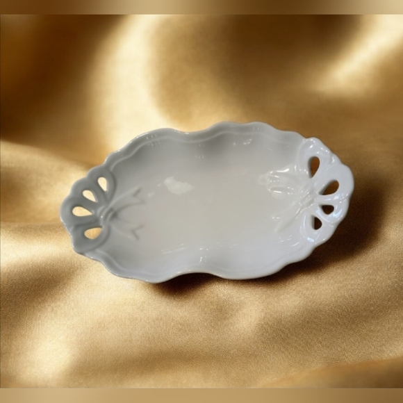 The design elements, particularly the scalloped edge and the distinctive bow and ribbon. Which features "ribbons of silk-like glaze" on porcelain.