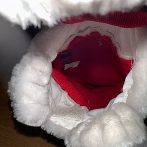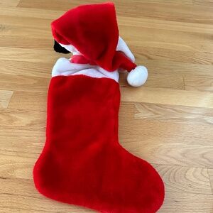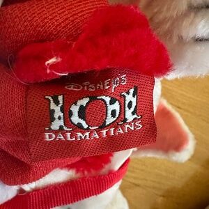 Vintage Disney 101 Dalmatians Plush Christmas Stocking. From the 1990's, red plush stocking with a 101 Dalmatian head and paws peering out of the stocking's opening; velcro closure. Green satin bow sewed onto the front white plush cuff area of the stocking. Dalmatian is wearing a Santa hat. The eyes are hard plastic and they're in excellent, scratch-free condition. Hanging loop has stitching around a heavy cord. The stitching has frayed in an area but the underlying cord is strong with no sign of breaking. 101Dalmatians patch on front toe area. The plastic coating has peeled away but "101 Dalmatians" is still legible. Excellent, clean condition.