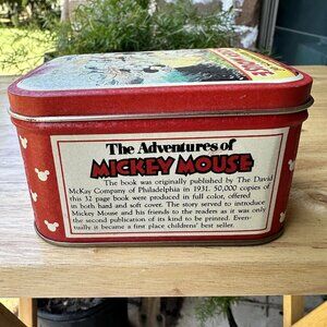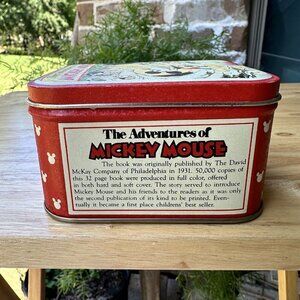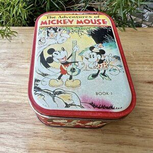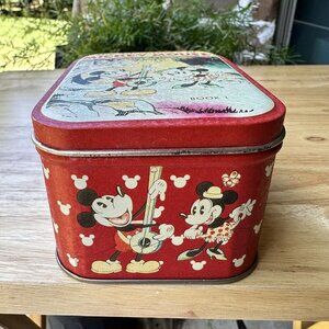 This vintage 4" Bristolware tin features the beloved characters of Mickey and Minnie Mouse from the Disney Adventures of Mickey Mouse series. The colorful design showcases the two iconic mice in their classic poses, with the place of origin Hong Kong circa 1970s-1990s. This collectible tin is a must-have for any Disney fan or collector of vintage merchandise. It is perfect for storing small items, displaying them on a shelf, or using them as a decorative piece in any room of the house. This vintage Disney Tin with music playing where Mickey is serenading Minnie Mouse with with mouse ears in lieu of love hearts is in good pre owned clean condition, it does have some paint impacts from handling wear along with minor oxidation of the metal, but overall no serious issues considering the age. Please see pictures for more detailed views and measurement information.