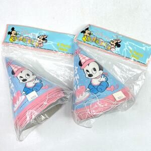 Set of two deadstock vintage Disney Babies themed party hats perfect for Baby's first birthday! Pink and blue with baby Mickey Mouse. I have two of these sets available as well as other Disney Babies party supplies, use the search bar at the top of my closet and create your own bundle!