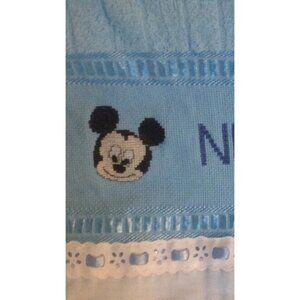 This is a Vintage Disney Baby Mickey Mouse Decorative Hand Towel that is monogrammed with the name Nicholas. It is beautifully designed and in a baby blue color. No rips or holes and is in really good condition.