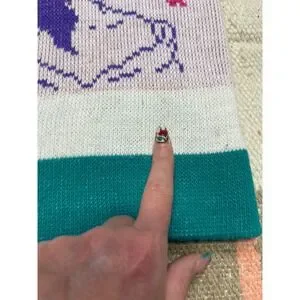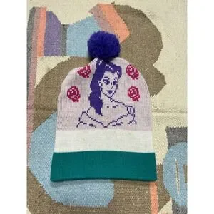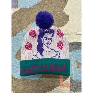 Vintage knit pom-pom beanie featuring Belle from Beauty and the Beast with bold, colorful graphics and a playful pom on top. Soft, cozy knit with a fold-over cuff that reads "Beauty and the Beast." Official Disney licensed piece with strong 90s/early Y2K vibes.