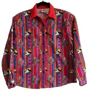 Absolutely amazing vintage Disney Mickey Mouse collared button down shirt. Vibrant colors and a unique Cowboy Mickey pattern! There is a bit of fading due simply to age but there are no major flaws, rips, stains, tears, etc. Size Small and I've included a few measurements below. This is such a unique piece- and it even has shoulder pads!