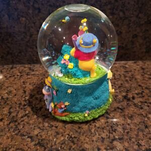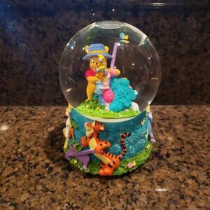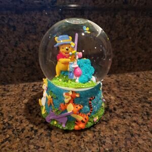 Disney by Enesco vintage musical snow globe with gardening Pooh and Piglet, Rabbit and Tigger on the bottom. In great working condition from a smoke free home.