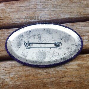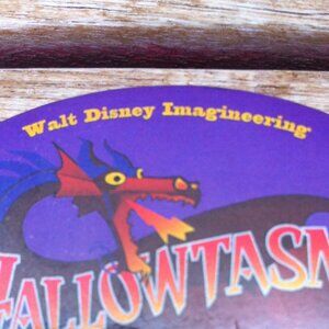 This rare pin-back button was given to Walt Disney Imagineers who worked on Fantasmic! at Disneyland in 1992. The oval button is a parody of the Fantasmic! logo which reads "Hallowtasmic!" over the Fantasmic! dragon. To the left of the logo is a bag that reads "Trick or Treat". This pin is a WDI Disneyland Cast Member exclusive. It measures 2.75 inches x 1.75 inches.