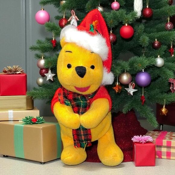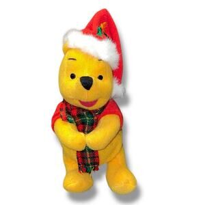 Vintage Disney Plush Stuffed Mattel Winnie the Pooh Santa Hat Christmas Plaid Scarf 1999 8” Nursery Bedroom Decor, Baby Shower Gift, Animal Wildlife Nature Nostalgia Theme