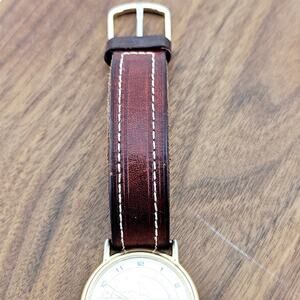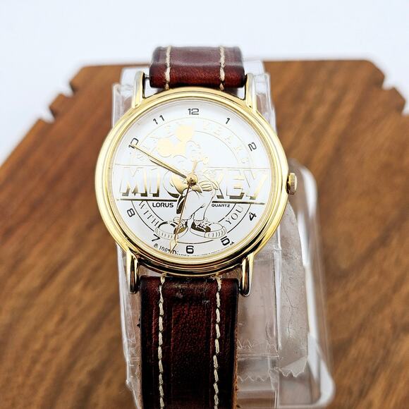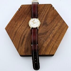 Vintage Disney Mickey Mouse 60 Year Wrist Watch Gold Tone Brown Leather Band
