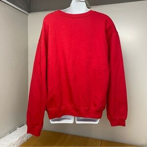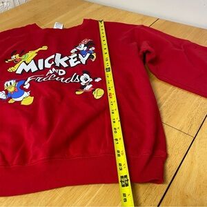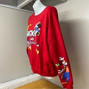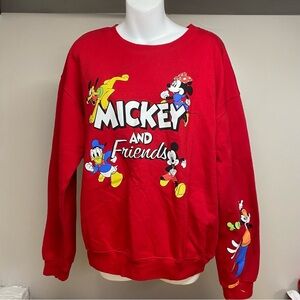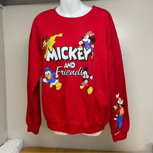 This vintage Disney sweatshirt features Mickey Mouse and his friends in a red background. It is a large size, perfect for teens or women who love Disney. The sweatshirt is part of the Disney collectibles