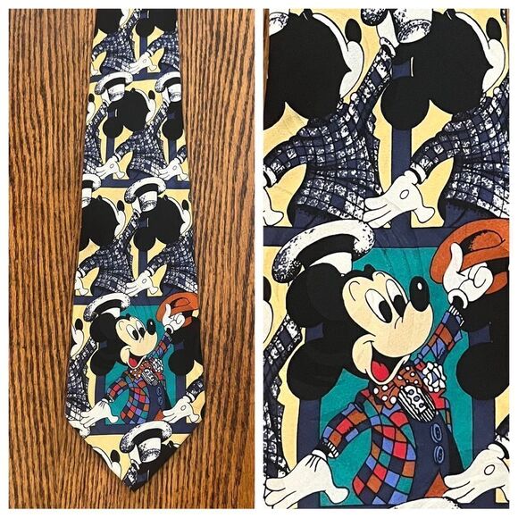 Classic Mickey Mouse tie. Features yellowish tan background and navy blue Mickey motif with single colorful Mickey. Approximately 4” thick at thickest point. Silk. In excellent used condition. Photos are a part of the description. Color may vary with lighting or device.