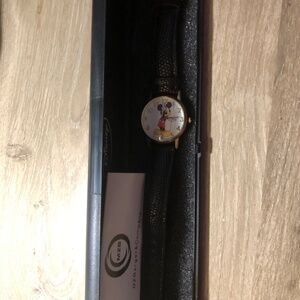 This is a very good condition vintage watch. Mickey Mouse's hands move around the dial. Slight wear to the genuine leather band. Needs a new battery.