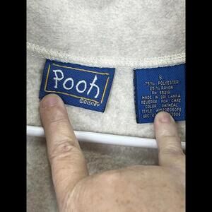 This vintage Disney sweatshirt features a 1/4 zip closure and a collared neckline, making it perfect for both casual wear and activewear. The gray color and solid pattern are accented with a zipper and the iconic Winnie the Pooh logo. The long sleeves and regular fit make it comfortable for walking or any other activity. The sweatshirt is made of polyester fleece and is machine washable for easy care. It is a women's size small and is part of the Disney product line. This sweatshirt is perfect for fans of the cartoon, TV, and movie character theme. Get this unique piece for your wardrobe today!