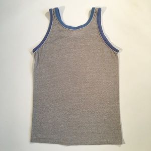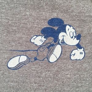 Vintage (1980s) Disney Character Fashions brand tank top. Heather grey with blue and white details and 2-color print Mickey Mouse graphic.