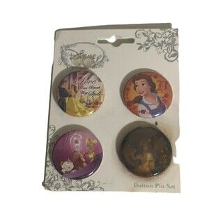This vintage set of 4 Beauty and the Beast buttons is a must-have for any Disney and movie collector. The buttons feature the beloved Disney characters from the classic tale, including Belle and the Beast. The buttons are perfect for adding a touch of nostalgia to your backpack, jacket, or pin board.
