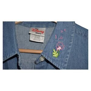 Authentic vintage Disney Store sleeveless button-up shirt featuring embroidered Eeyore and Piglet characters on the front, plus floral detail on the collar. Soft 100% cotton denim with a relaxed fit — perfect for Disney lovers and 90s nostalgia collectors.