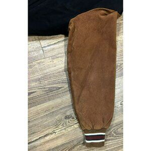 Some wear on suede sleeves and minor discoloration on ribbed cuffs. Measurements: Top to bottom = 25 inches, Shoulder to shoulder = 20 inches.