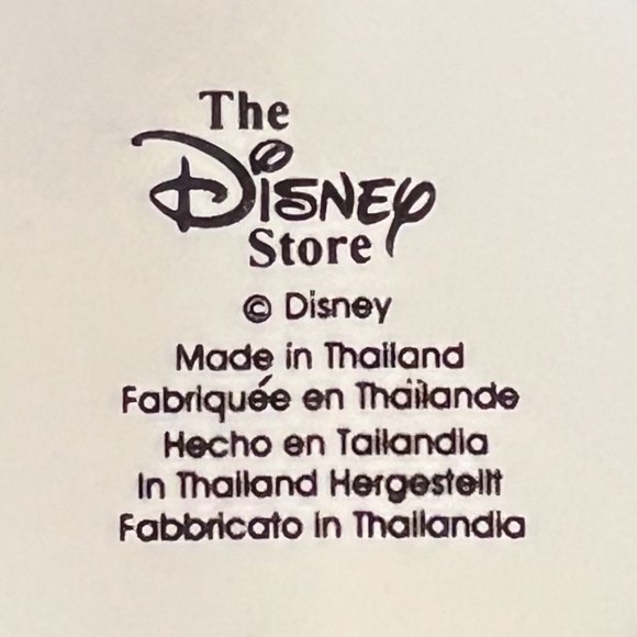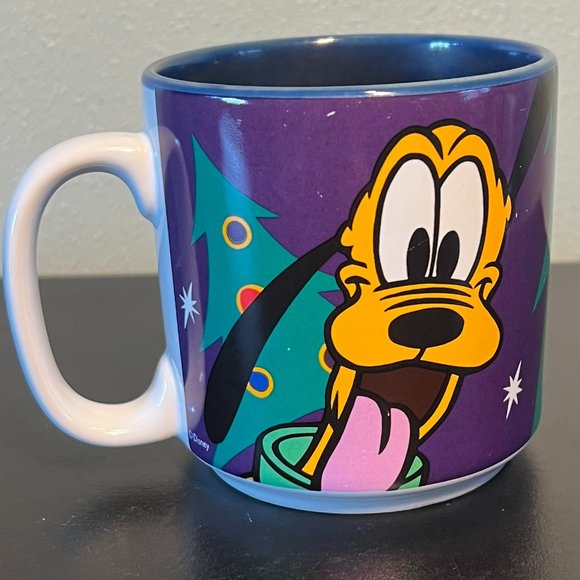 Delightful vintage ceramic mug features a wraparound design of Mickey Mouse’s sweet dog Pluto next to decorated Christmas trees against a deep purple with white stars background. Dark blue rim and interior with a white handle. Made in Thailand.