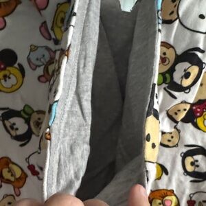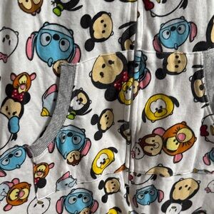 So cute & comfy! This vintage Disney onesie with playful Tsum Tsum character design. Features a kangaroo pocket and soft cuffs and ankles. The hood is lined with a soft grey.
