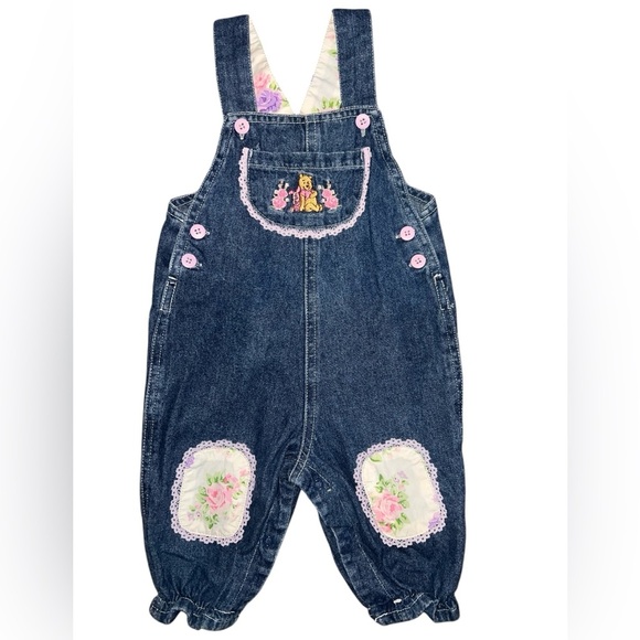 Vintage Disney Winnie The Pooh Denim Overalls Floral Lace Patch 6-9 Month