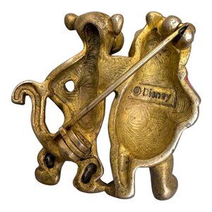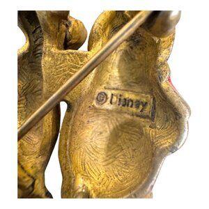 Own a piece of nostalgia with this charming vintage Disney brooch featuring Winnie and Tigger in a playful pose. Its gold tone finish and vibrant enamel details make it a delightful addition to any collection. A unique and whimsical accessory for Disney enthusiasts and vintage collectors alike.