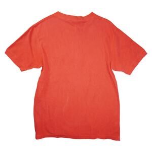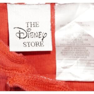 Vintage Disney Store short sleeve henley shirt featuring Winnie the Pooh and Piglet embroidery graphic with buzzing bees. Classic 3-button front in a faded red/orange tone. Made in Singapore from 100% cotton.