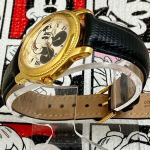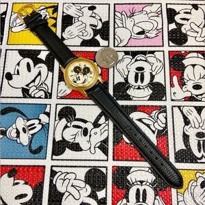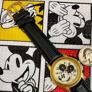 Vintage Disney X Lorus by Seiko Mickey Mouse multifunction unisex watch. Watch case is small for a man's by today's standards. Please ensure size works for you before purchasing. Watch features a gold-tone case with Mickey on the dial with sub-dials for month and date in his "ears". Also has Roman numeral indices and sub-dial for 24-hour clock. Dial is marked, "Lorus Quartz, (c)Disney" and "Mov't Japan, V33G-6A98 HR1" at bottom edge. Case back is marked, "Lorus, Mov't Japan, Water Resistant, Stainless Steel + Base Metal, V33G-6B10 R1." Watch case measures approx. 36mm across excluding crown, and watch with lizard embossed leather measures approx. 9 3/4" (max wrist size of approx. 7 1/2"). Watch is in good vintage condition with a scratch-free crystal and light scuffs / scratches to the case. Leather strap is new and not original to the watch. Watch has a new battery, keeping time, and date and 24-hr. clock are working as they should. Month is not changing automatically, but is easily advanced with crown in second position. A cool Mickey multifunction watch! Thanks for checking out my closet!