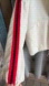 Single stitch. 2 front pockets. Full zipper. Hood with drawstring. Cream color with red and black stripes on sleeves. Drawstring elastic on bottom. Elastic cuffs.