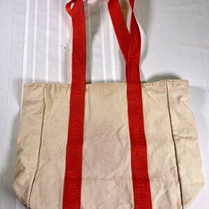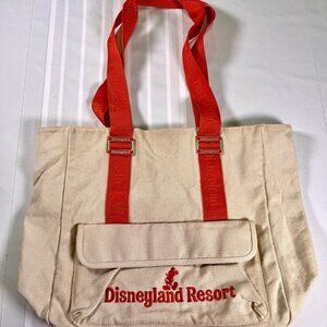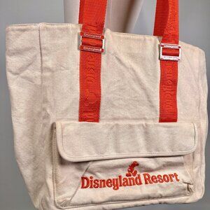 Authentic Disneyland Resort canvas tote bag featuring bold orange embroidered logo with Mickey Mouse and large front flap pocket.