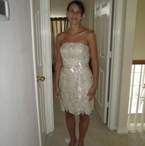 Zipper front and hood. Soft tan material. Elastic straps to go around feet and hands. A few spots on the mouth area which have not been treated or attempted to clean. The elastic straps also have some staining. All blemishes shown in photos. Size is a 4T, but appears as though it would fit a larger size as well.