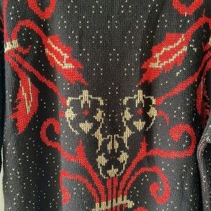 Acrylic and wool blend. Awesome sweater with cool design. The design is in metallic shimmery threading. Gold shimmering threading throughout in little v shapes. Great with jeans, skirts. Smoke free environment. No stains, holes or discoloration.