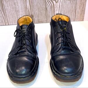 Dr Martens vintage, made in England 4-eye mid rise shoe - boot in black leather. Preowned with minor signs of wear including some wear on rubber heels.