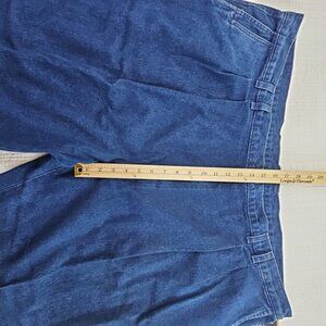 These Vintage Dockers Jeans are a classic piece of men's clothing from the 80s, made in the USA with a high rise fit. The pleated design and solid blue color give them a retro feel, perfect for those who appreciate a hipster, bohemian look. Made of cotton denim with a zip and button closure, these jeans also feature pockets for added functionality.