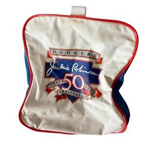 Rare 1997 LA Dodgers duffle bag with Jackie Robinson 50th anniversary patch. Blue body with red piping, white ends, and AAA Southern California logo. Some visible signs of wear, great collector’s piece.