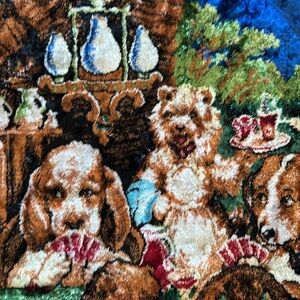 Tags vintage 60’s 70’s dogs playing poker kitsch whimsical fun funny bar decor saloon decoration collection collections terrier beagle setter spaniel mutt bulldog cards spades hearts aces clubs drinks conversation piece college dorm room frat fraternity wall hanging picture art Man cave den billiard room living room rug throw art velvet lounge lodge pool room game room playroom a friend in need cassius Marcellus Coolidge cabin lake house mid century modern rustic historical iconic recognized famous tacky woven prop restaurant