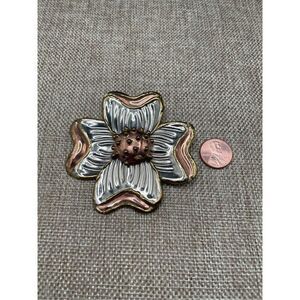 It has silver tone metal petals with gold tone and copper accents. It has a copper center with gold tone beading. It has a pin and bail on the back. measures 3 inches long and wide.