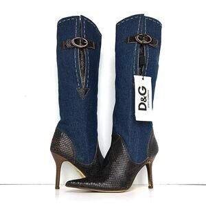 Vintage Dolce and Gabbana Denim Snakeskin Tall Pointed Toe Heeled Boots 35
