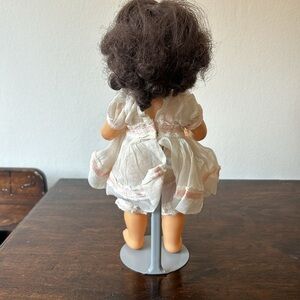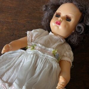 Charming vintage doll wearing a white dress with pink accents. Perfect for collectors.