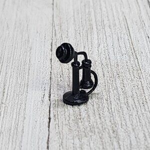 This vintage dollhouse set includes a Victorian mirror, hurricane lamp, and black telephone. Scaled perfectly for dollhouse display, these miniature pieces add a touch of historic charm to any collection.