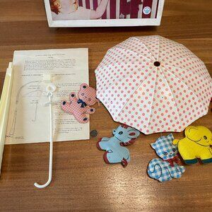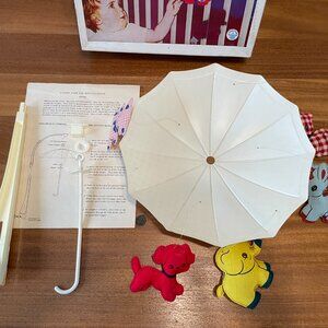 Unique vintage Dolly Toy Animal Shower Baby Crib with original box and instructions. Please see all pictures for condition, one piece of hangar and one animal missing, but great for a DYI vintage nursery or other project. Smoke-free. Thank you!