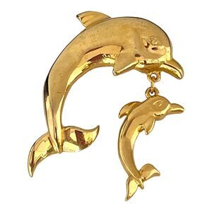 This beautiful pin is gold toned and features a mother and baby dolphin swimming.
