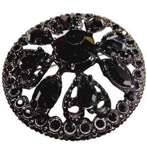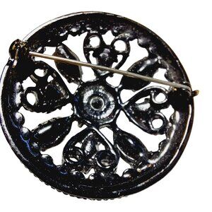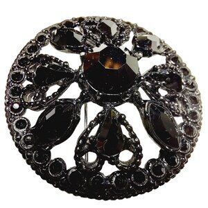 Vintage Domed Black Rhinestone Round Brooch Filigree Design Mourning Pin