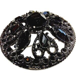 This vintage brooch showcases a domed filigree design adorned with black rhinestones, reflecting a timeless and elegant Victorian mourning style. Its intricate craftsmanship and secure pin closure ensure both functionality and a touch of antique charm.