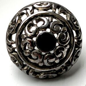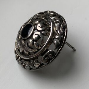 TAGS: vintage earrings, silver tone studs, button earrings, domed earrings, openwork earrings, black cabochon, filigree scroll earrings, retro jewelry, goth accessories, elegant vintage jewelry