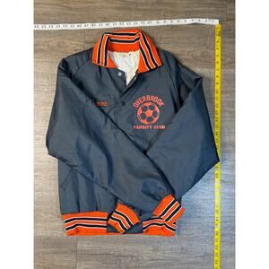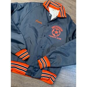 This vintage Overbrook Varsity Club jacket is a unique collectible piece featuring a bold soccer graphic, custom "Amos" embroidery, and vibrant orange and navy accents. Perfect for fans of classic varsity style, this jacket embodies retro athletic charm.