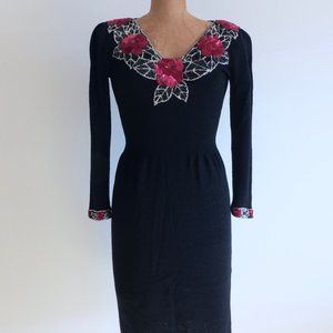 Stunning vintage 80's - 90's black wool knit cocktail dress with embellished sequins and beads neckline trim by Don Sayres for Wellmore - I. Magnin