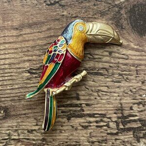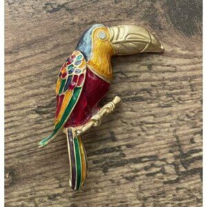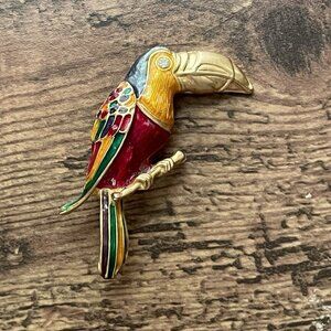 Gold tone toucan with rhinestone eye and colorful green, gold and red enamel feathers