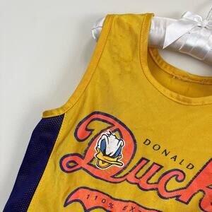 Vintage Donald Duck 100% Extreme Athletic Tank. Tags removed, so please see photos for measurements. I'd guess about a 5/6. Sleeveless yellow and purple top. Has wear and lots of loose threads; see photos.