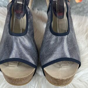 4.5” heel with “ platform. Beautiful leather slingback shoes in a metallic blue with an stretchy sling back to hold your foot in place. Heels are gorgeous condition. One slight scuff on the shoe as shown in the picture so please review them carefully.