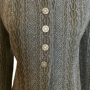 This Doncaster vintage blue and black raised pattern blazer and skirt set has four brushed silver tone buttons with stars on them. These photos don't do this stunning two pice vintage suit justice! It has padded shoulders and the pencil skirt has a zipper and a hook and loop closure in back. Both the jacket and the skirt are fully lined and are made with an acrylic, wool, acetate blend fabric. Size 4P measurements are Jacket pit to pit 18 1/2” length 23” sleeve 23” Skirt waist 12 1/2” length 21 1/2” This is a beautiful and versatile set that can be styled so many ways and would be a wonderful addition to your wardrobe! 😊